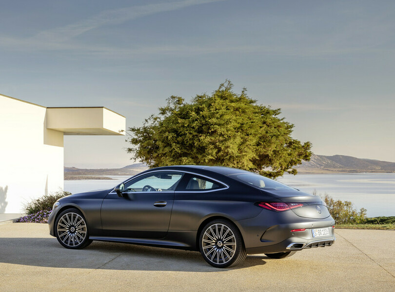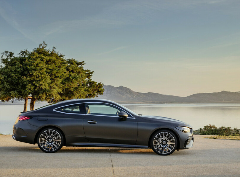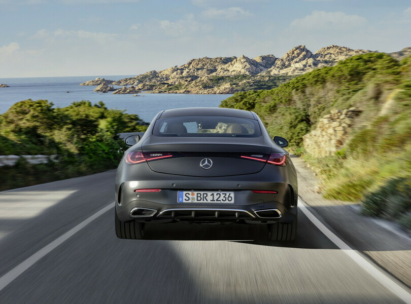 Er ist weder C- noch E-Klasse, sondern setzt sein eigenes Maß: CLE hat Mercedes-Benz sein neues Coupé getauft, das 4,85 Meter lang ist und damit die beiden genannten Vorgänger um 16,5 bzw. 1,5 Zentimeter übertrifft, höher als das C-, aber niedriger als das E-Klasse-Coupé ist, beim Radstand hingegen wieder etwas kürzer als der E ist. Mit weit nach hinten gerückter Fahrgastzelle, stark geneigter Frontscheibe, zum Heck hin fließend abfallendem Dach und Motorhaube mit zwei Powerdomes verkörpert der CLE klassische Coupé-Tugenden. Die Frontpartie ist leicht nach vorne geneigt, die Spurweite hinten etwas breiter als beim E-Klasse-Coupé.