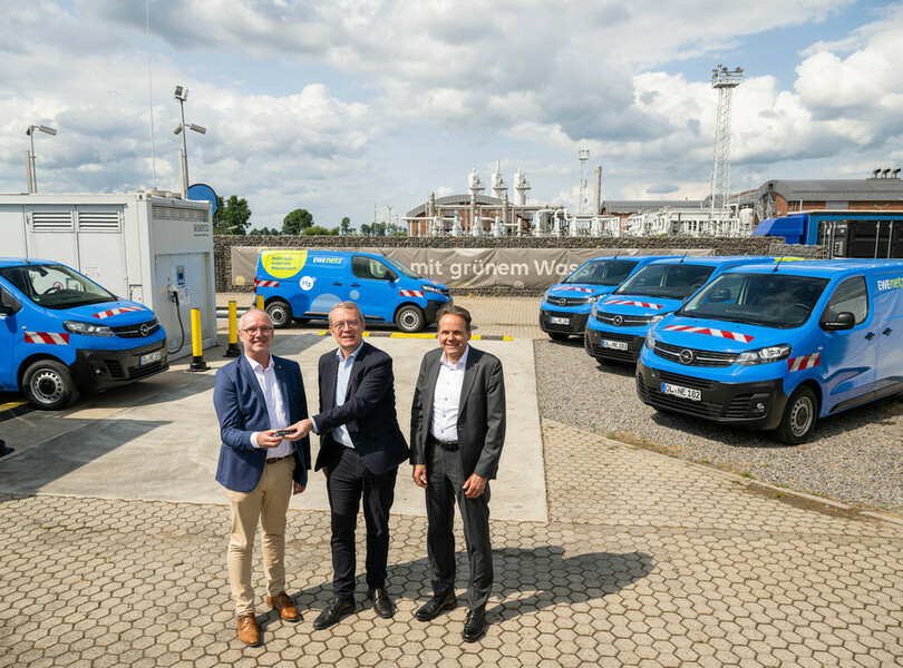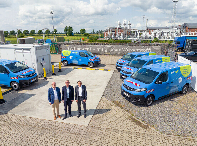 Übergabe von fünf Opel Vivaro-e Hydrogen (v.l.): Torsten Maus (Geschäftsführer EWE Netz), Jean-Michel Billig (Chief Technology Officer bei Stellantis) und Dr. Urban Keussen, CTO EWE. Foto: Autoren-Union Mobilität/Opel