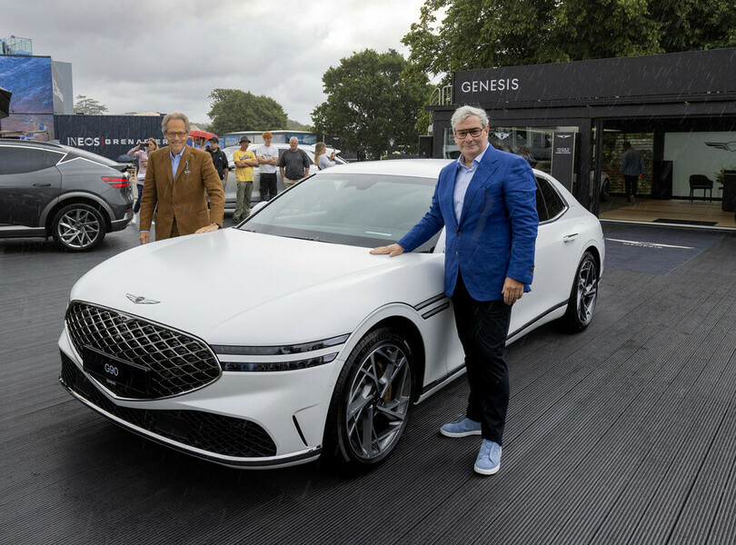 Europapremiere für den Genesis G90 beim Goodwood Festival of Speed (v.r.): Luc Donckerwolke, Chief Creative Officer (CCO) der Marke, und Gastgeber Charles Gordon-Lennox, Duke of Richmond. Foto: Autoren-Union Mobilität/Genesis