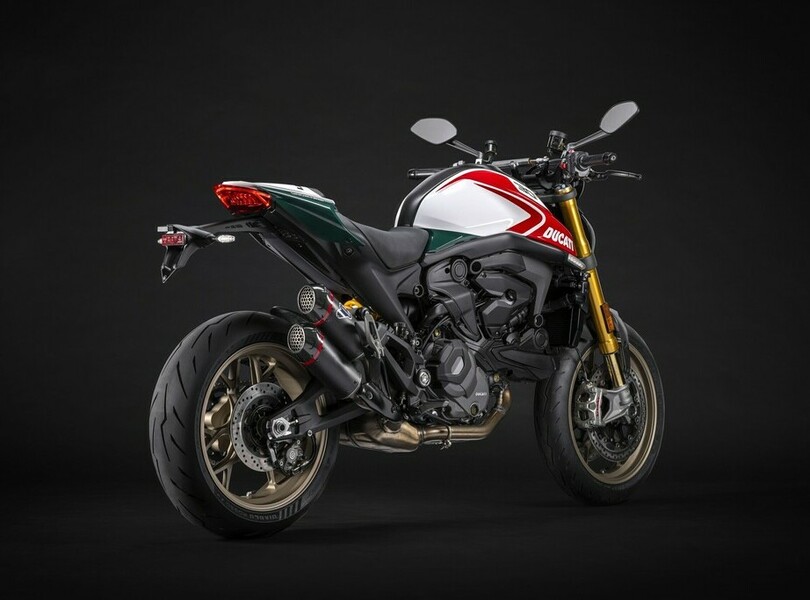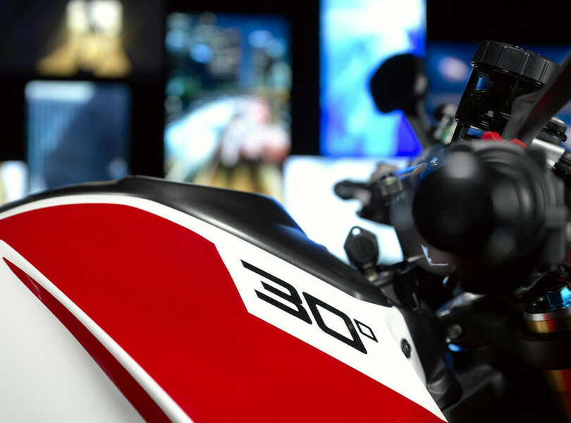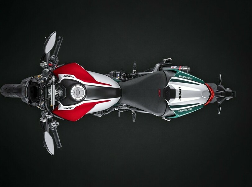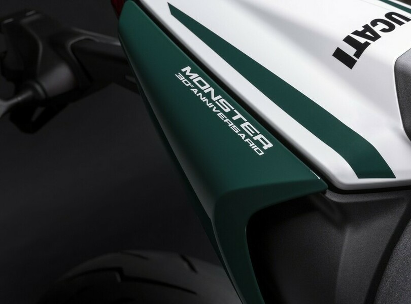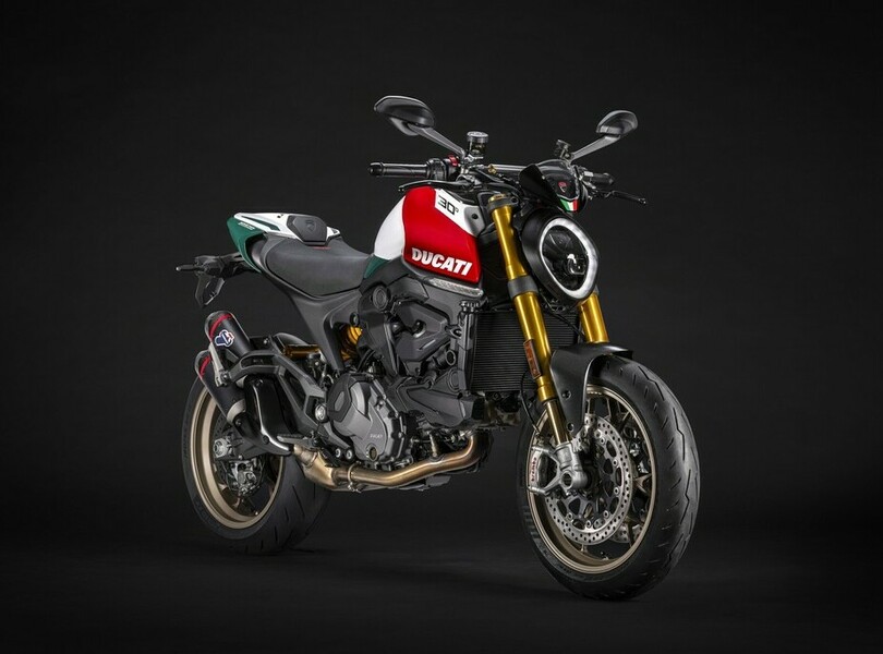 Mit einer auf 500 Stück limitierten Sonderedition feiert Ducati feiert das 30-jährige Bestehen der Monster-Baureihe. Von dem puristischen Naked Bike wurden mittlerweile über 350.000 Exemplare verkauft. Die Monster ,,,,30° Anniversario"ist im Tricolore-Stil lackiert, trägt exklusive goldfarbene Felgen, die auch das Trägheitsmoment der Räder reduzieren, und ist mit einer Öhlins-NIX30-Gabel ausgerüstet. Weitere Merkmale sind der mit einem gestickten 30-Jahre-Logo verzierte Sitz und eine spezielle Animation im Display sowie Carbon-Kotflügel. Jedes Fahrzeug erhält eine Plakette auf der oberen Gabelbrücke mit dem Modellnamen und der Exemplarnummer und wird mit Echtheitszertifikat und einer speziellen Abdeckplane ausgeliefert.