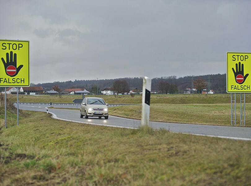 Letzte Warnung. Wer als Falschfahrer auf der Autobahnausfahrt landet, sollte dauf grelle, neon-farbene Stop-Tafeln stoßen. Foto: ADAC/Bastian Fischer