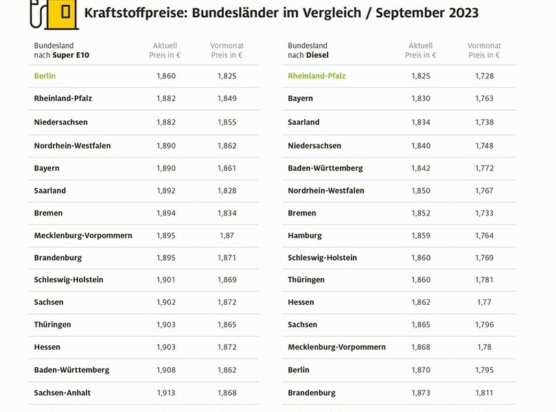 Die durchschnittlichen Kraftstoffpreise in den einzelnen Bundesländern (21.9.2023). Foto: Autoren-Union Mobilität/ADAC