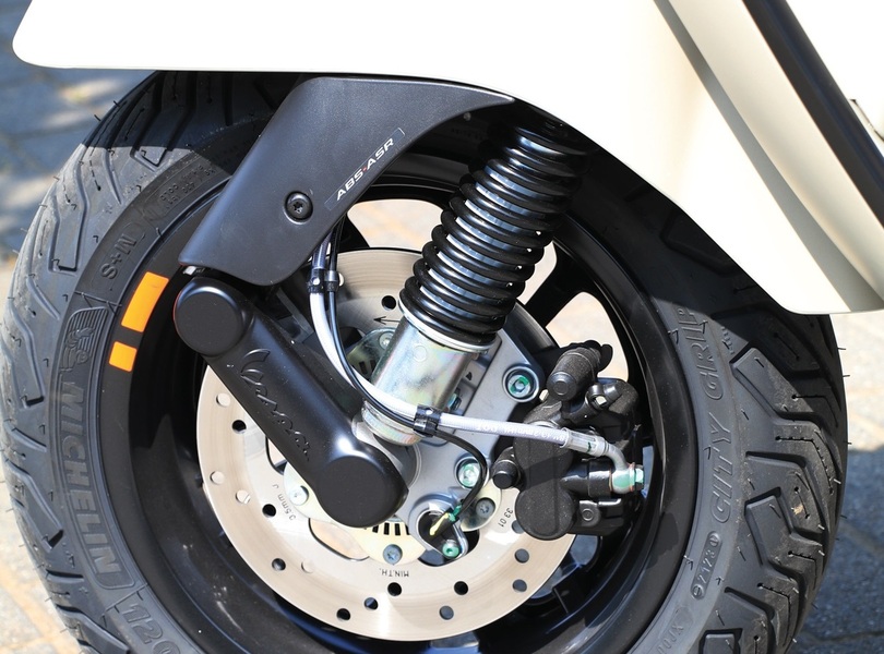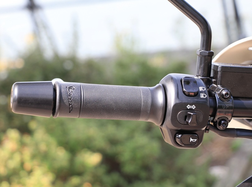 Das besondere Erlebnis "Vespa" macht sich auch an kleinen Details wie den Lenkergriffen mit Markenschriftzug bemerkbar Foto: RKM