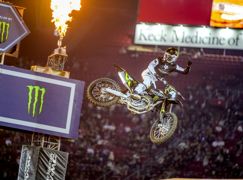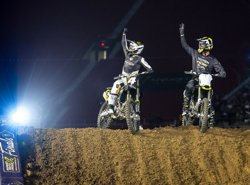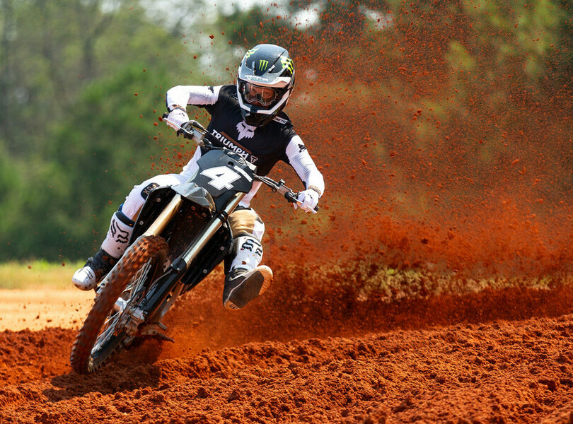 Beim Finale der Super-Motocross-WM in Los Angeles hat Triumph zum ersten Mal sein erstes Motocross-Modell der Öffentlichkeit präsentiert. Für den entsprechenden Showeffekt sorgten ein Feuerwerk und Fanfarenklänge. Gelenkt wurden die beiden 250er von den Fahrerlegenden Ricky Carmichael und Jeff Stanton.