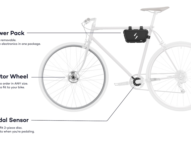 Auch die Version Go setzt auf die drei Hauptelemente Frontmotor, Trittfrequenz-Sensor und Akku Foto: Swytch Technologies