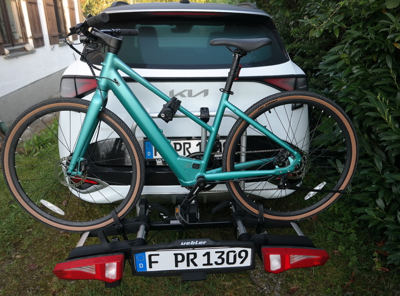 Kein Problem: Das E-Gravel lässt sich leicht auf den Fahrradträger heben Foto: Rudolf Huber/SP-X