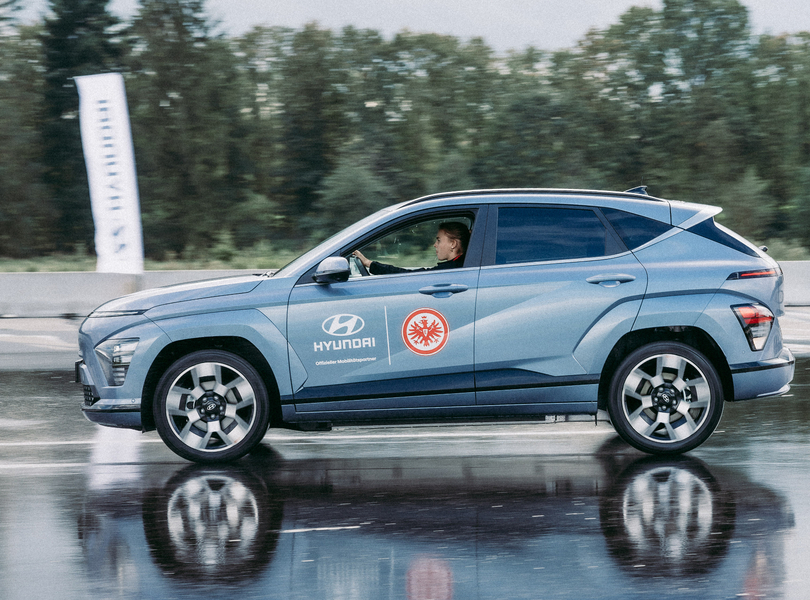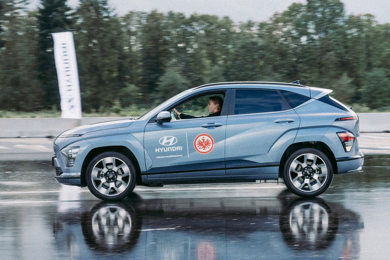 Die Fußballerinnen von Eintracht Frankfurt stromern über eine Teststrecke, um im Rahmen eines exklusiven Fahrtrainings die vollelektrischen Modelle von Hyundai kennenzulernen.