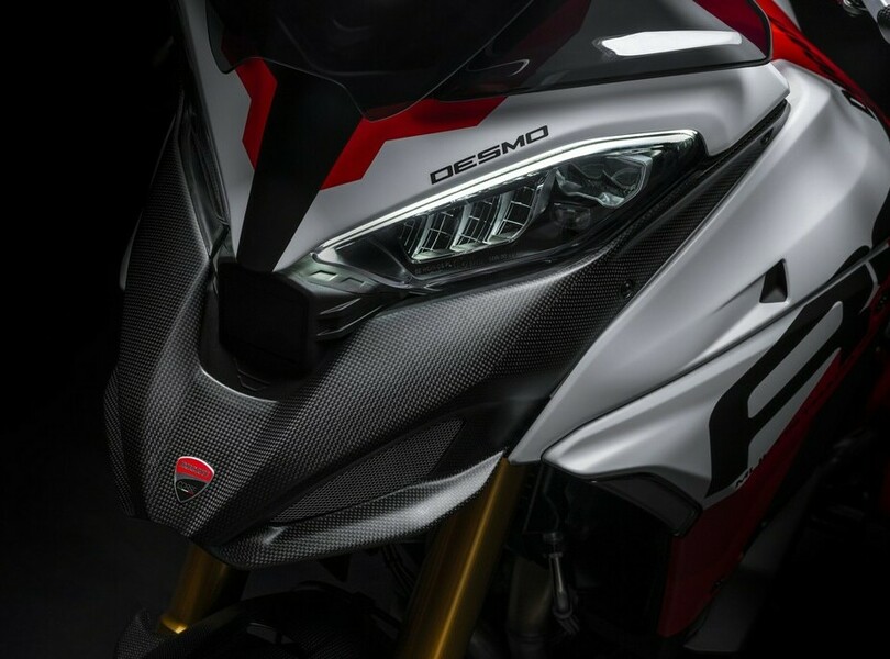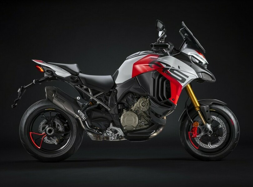 Ducati erweitert die Multistrada-Palette um die V4 RS, die ihre Premiere auf der Mailänder EICMA (7.-12.11.2023) feiert. Hauptmerkmale der rennstreckentauglichen Maschine sind der von der Panigale bzw. Streetfighrter abgleitete 1,1-Liter-Superbike-Motor und das Fahrwerk der Multistrada V4 Pikes Peak. Die Leistung des zwangsgesteuerten Vierzylinders wurde für die neue Multistrada auf 180 PS (132 kW) zurückgenommen, sind aber immer noch zehn PS mehr als in der Baureihe üblich. Der Drehzahlbegrenzer setzt erst bei 13.500 Umdrehungen pro Minute ein, die Endübersetzung wurde kürzer ausgelegt. Die Auspuffanlage mit Schalldämpfer des neuen Partners Akrapovic wurde eigens für die Multistrada V4 RS entwickelt.