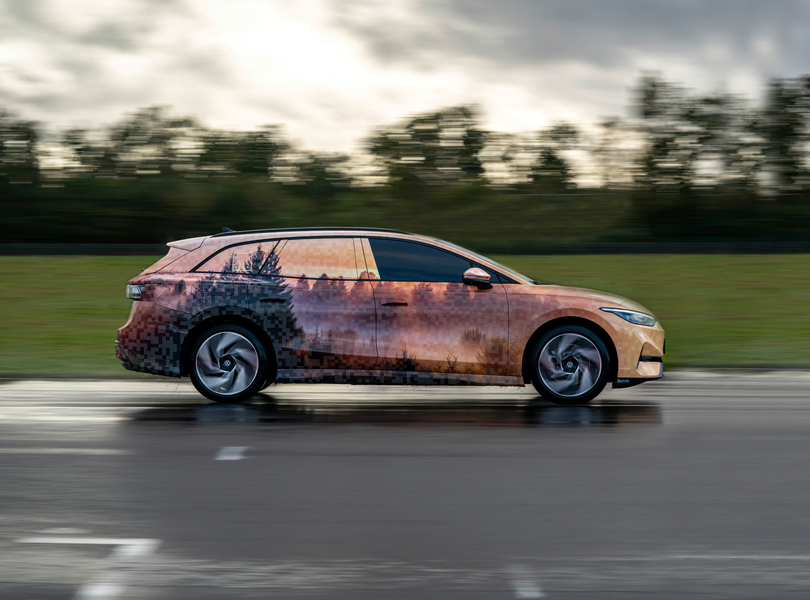 Volkswagen präsentiert erste Fotos der noch getarnten Kombi-Version des vollelektrischen Top-Modells ID.7 und stellt gleichzeitig den neuen Namen vor: