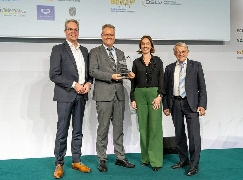 Verleihung des Europäischen Sicherheitspreises Nutzfahrzeuge 2023 (von links): Jann Fehlauer, Geschäftsführer DEKRA Automobil GmbH, Preisträger Ingo Scherhaufer, DVR-Präsidiumsmitglied Christiane Leonard-Thiemann und EVU-Präsident Jörg Ahlgrimm. Foto: Autoren-Union Mobilität/Thomas Kueppers/DEKRA