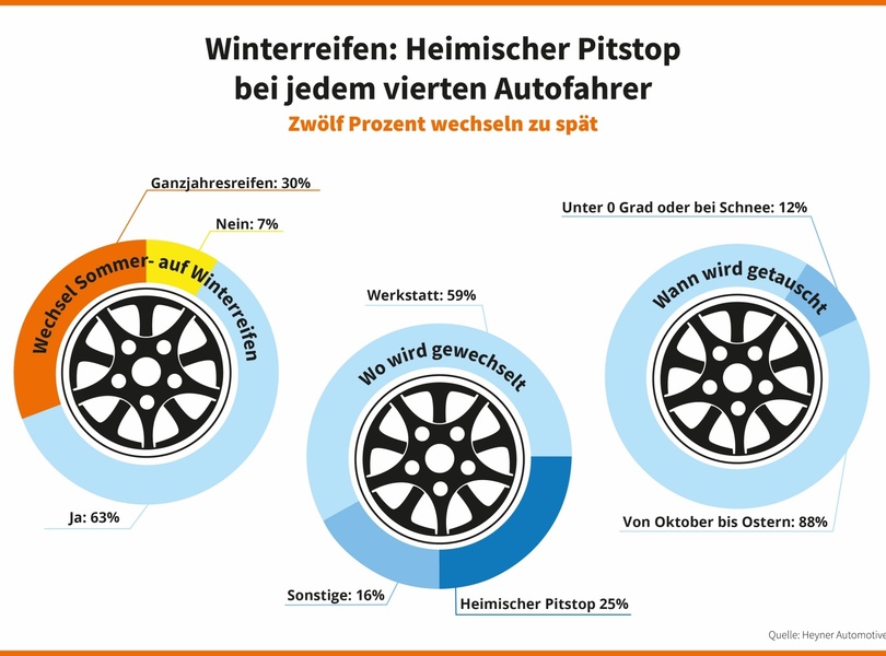 Nahezu zwei Drittel der Autofahrer wechseln in der kalten Jahreszeit auf Winterreifen, 20 Prozent tun dies aber zu spät, so das Ergebnis einer Umfrage des Autozubehör-Anbieters Heyner unter 1029 Pkw-Besitzern in Deutschland. Dabei tauscht ein Viertel der Befragten die Pneus selbst.