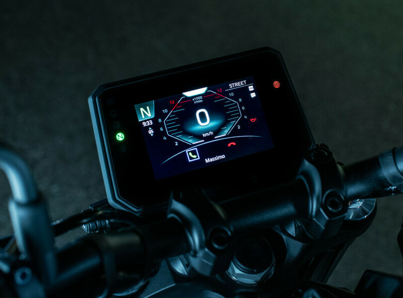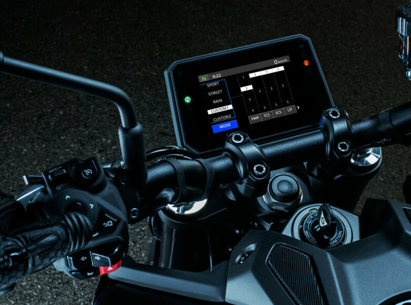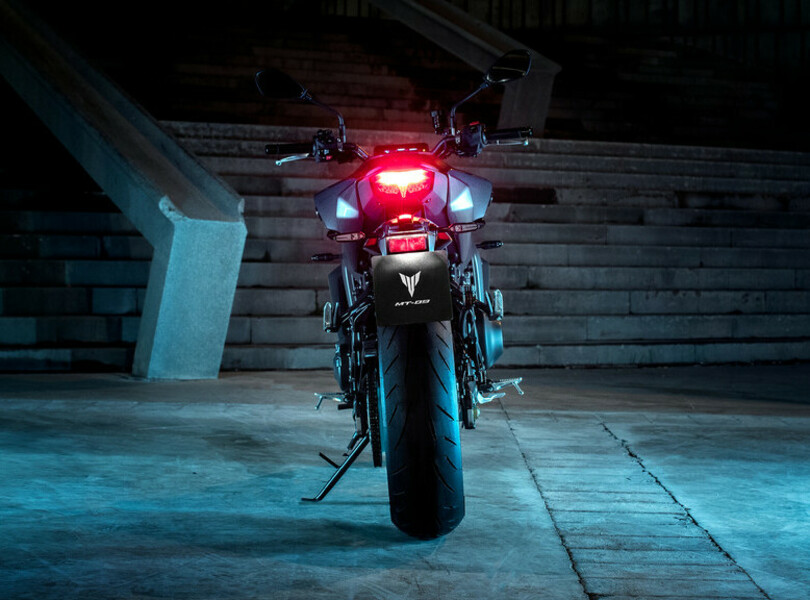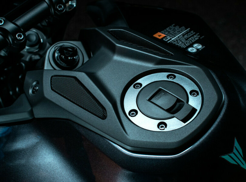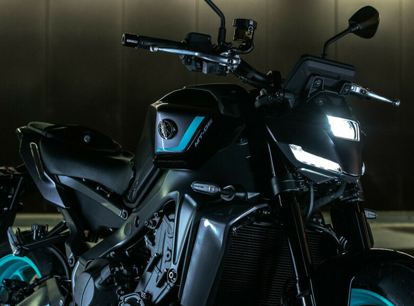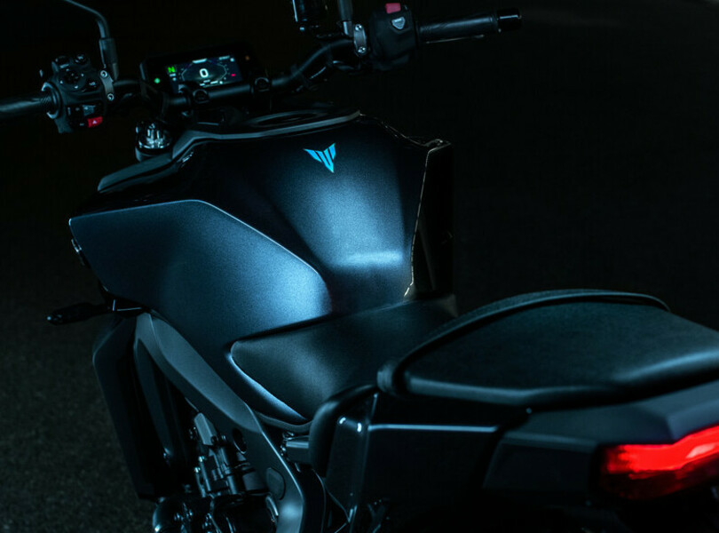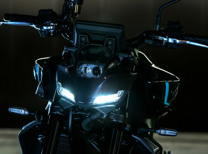 Für das nächste Jahr hat Yamaha die MT-09 einer umfangreichen Modellpflege unterzogen, die sich auch in einem erneut schärferen Look niederschlägt. Der LED-Scheinwerfer mit kompakterer Linse in neu gestalteter Abdeckung schafft eine Verbindung zum ebenfalls neu gezeichnetem Tank. Hinten gibt es ein neues Rücklicht mit separatem Bremslicht.