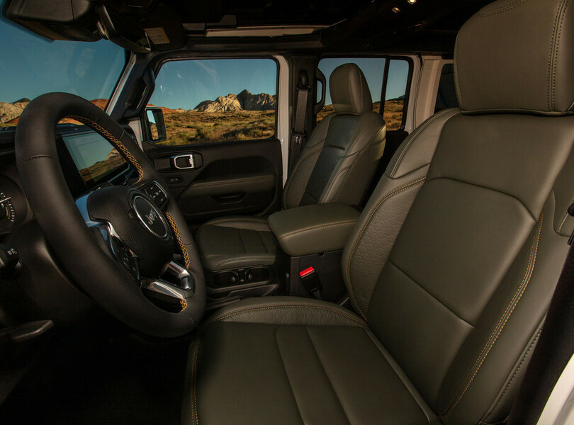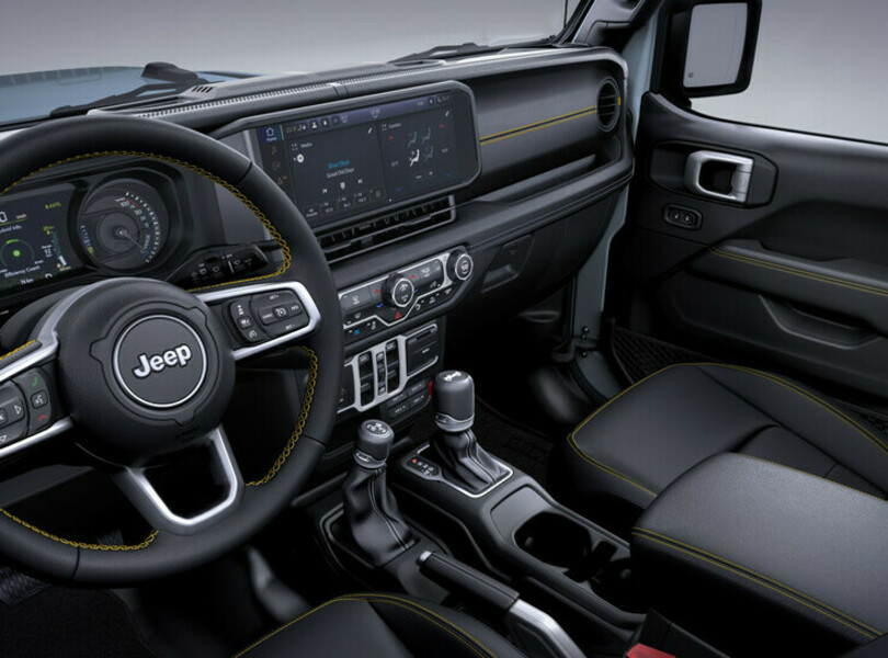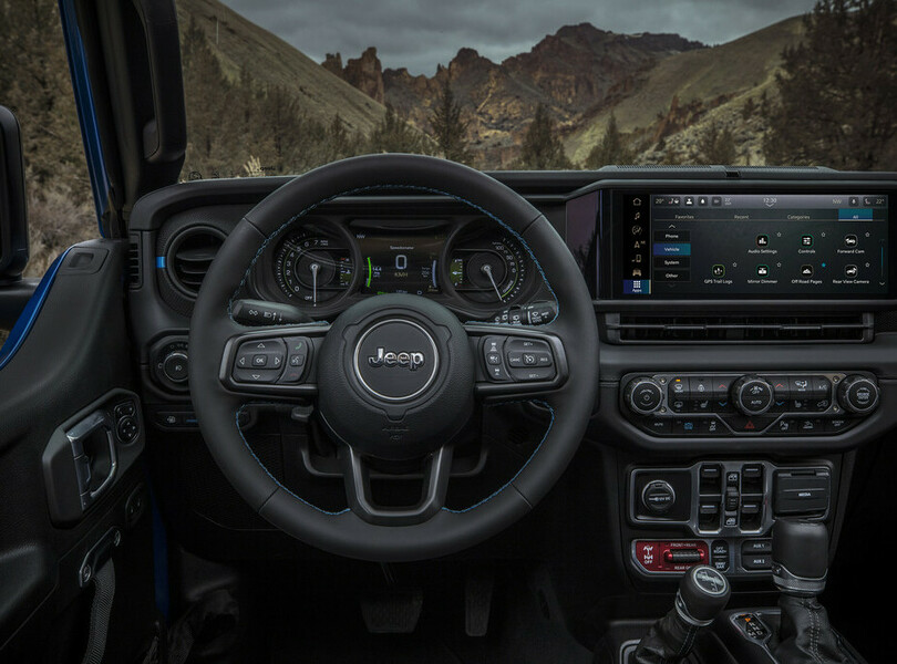 In Europa ist ab sofort der Jeep Wrangler des Modelljahrgangs 2024 erhältlich, der mit Technik- und Designneuerungen vorfährt und in den USA der meistverkaufte Plug-in-Hybrid ist. Die markenrechtlich geschützten sieben schwarz strukturierten Kühlergrillschlitze mit grauen Metalleinfassungen sind schmaler geworden und werden von einer Einfassung in Wagenfarbe umrahmt. Das Hardtop ist jetzt nicht nur in Wagenfarbe, sondern auch in Schwarz erhältlich. Das neue Armaturenbrett zeichnet sich durch eine klare, horizontale Form aus. Die ummantelte Instrumententafel verfügt über neue Soft-Touch-Oberflächen aus Stoff oder Polyurethan mit kontrastierenden Akzentnähten. Weitere Neuerungen im Interieur sind der um fast die Hälfte gewachsene Touchscreen (12,3 Zoll) für das Infotainmentsystem Uconnect 5 mit fünfmal schnellerer Rechenleistung. Bis zu acht Geräte können mit dem Wi-Fi-Hotspot an Bord gekoppelt werden.
