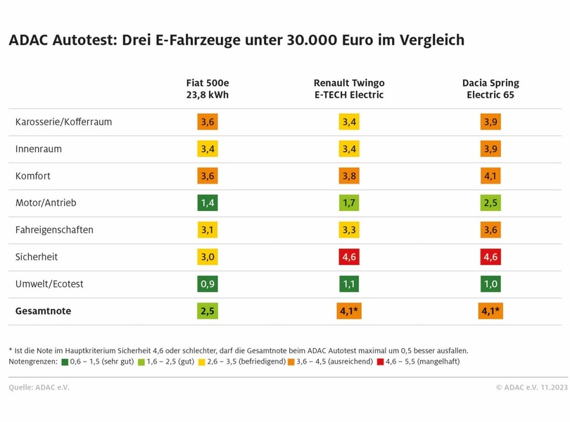 mid Groß-Gerau - Der Fiat 500e mit der Gesamtnote 2,5 ist klarer Sieger. ADAC