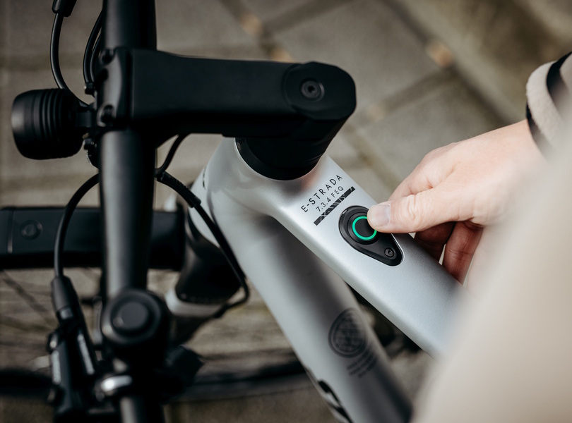 Über einen kleinen Knopf im Oberrohr kann der E-Antrieb aktiviert werden Foto: Stevens