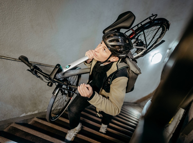 Das relativ leichte E-Bike von Stevens (17,6 kg) lässt sich noch einigermaßen entspannt Treppen hinauftragen Foto: Stevens