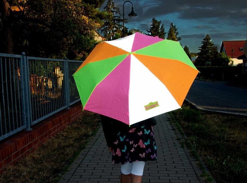 Mit einem regenbogenbunten Kinderschirm im Ranzen sind Schulkinder doppelt geschützt Foto: Scout