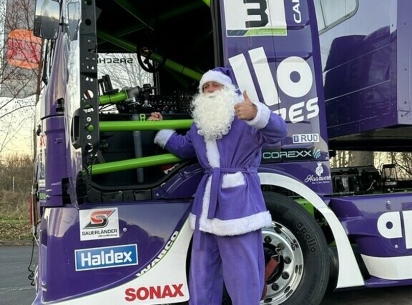 Apollo-Weihnachtstour 2023: Sascha Lenz an seinem Race Truck. Foto: Autoren-Union Mobilität/Apollo Tyres