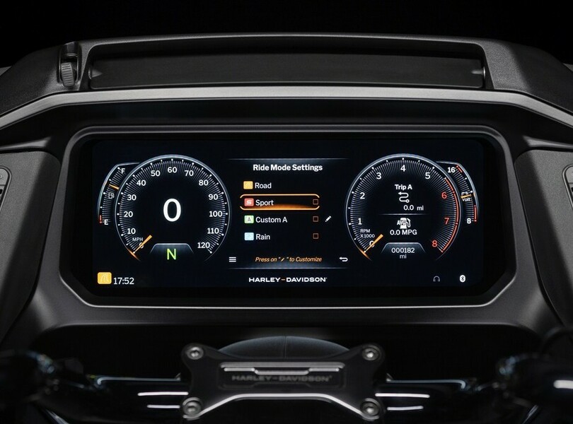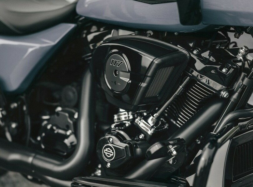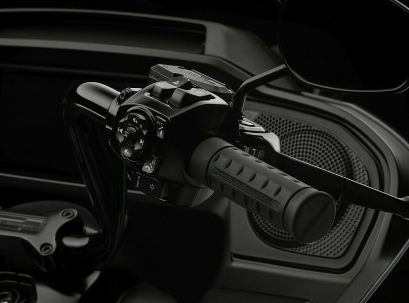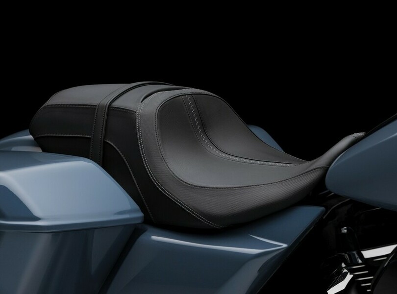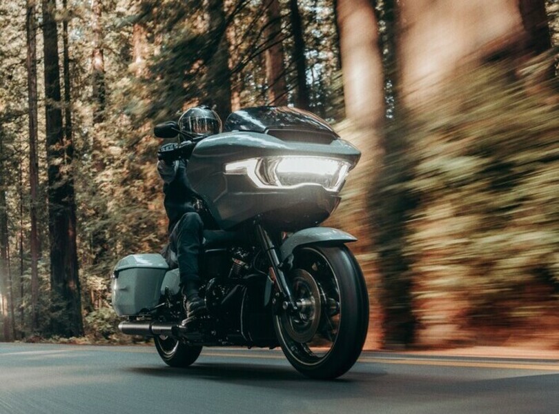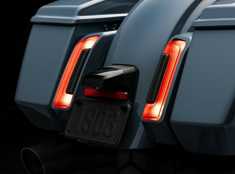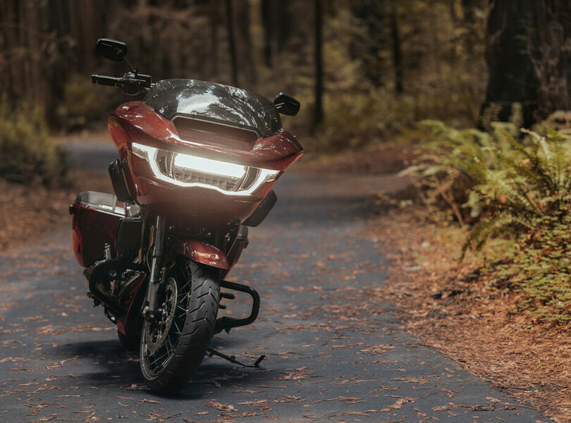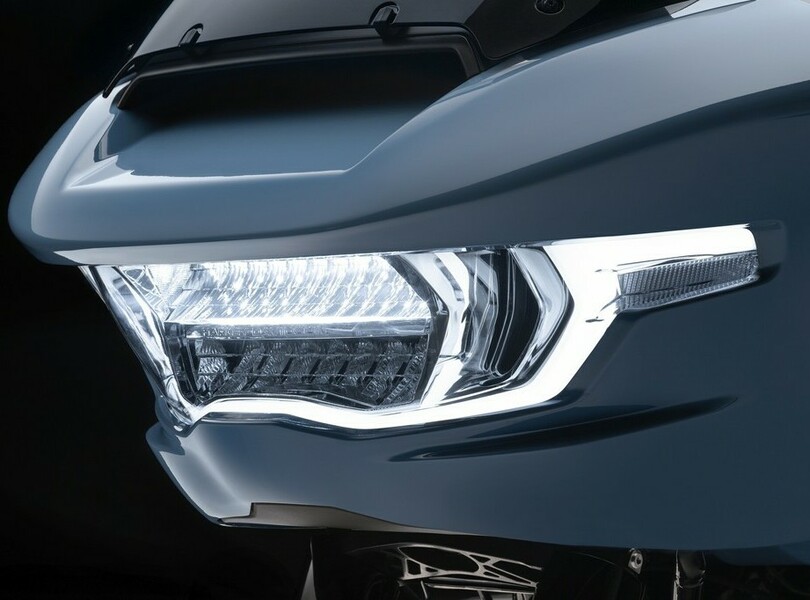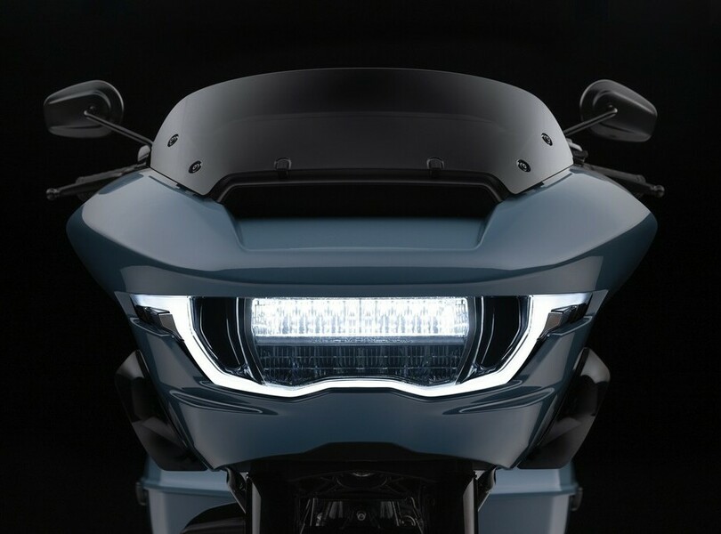 Parallel zur Street Glide rollt auch die Road Glide bei Harley-Davidson mit mehr Leistung und Komfort in die neue Saison. Die typische Sharknose-Front bleibt bei dem großen Tourer erhalten, der Doppelscheinwerfer verschwindet aber. Stattdessen gibt es eine eher T-förmige Einheit, die sich aus dem breiten Hauptscheinwerfer und einem geschwungenen Lichtband zusammensetzt, in dem das Tagfahrlicht und an den Enden auch die Blinker enthalten sind.
