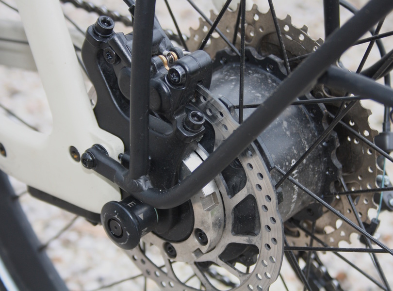 Der E-Motor befindet sich im Hinterrad. Zieht man den Knopf an der Achse, wird der Antrieb entkoppelt Foto: SP-X/Mario Hommen