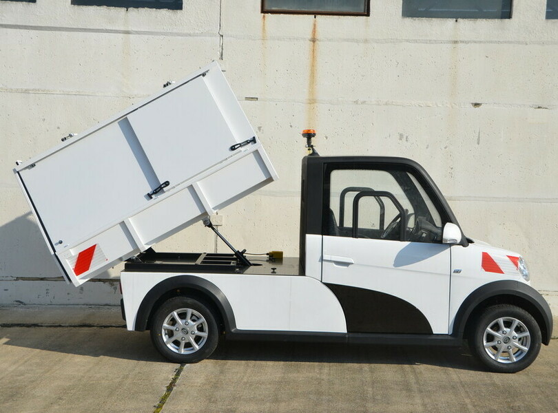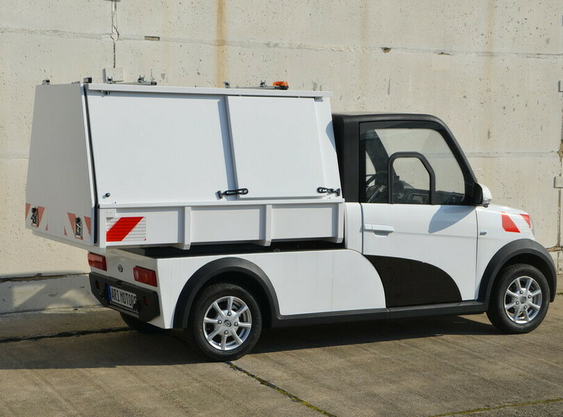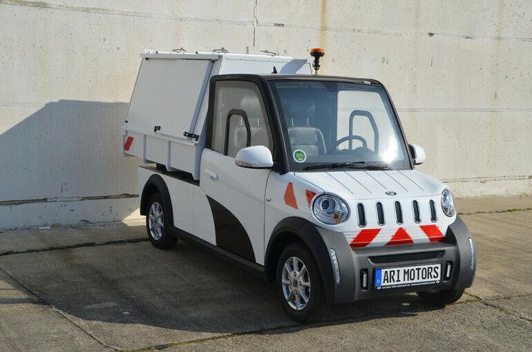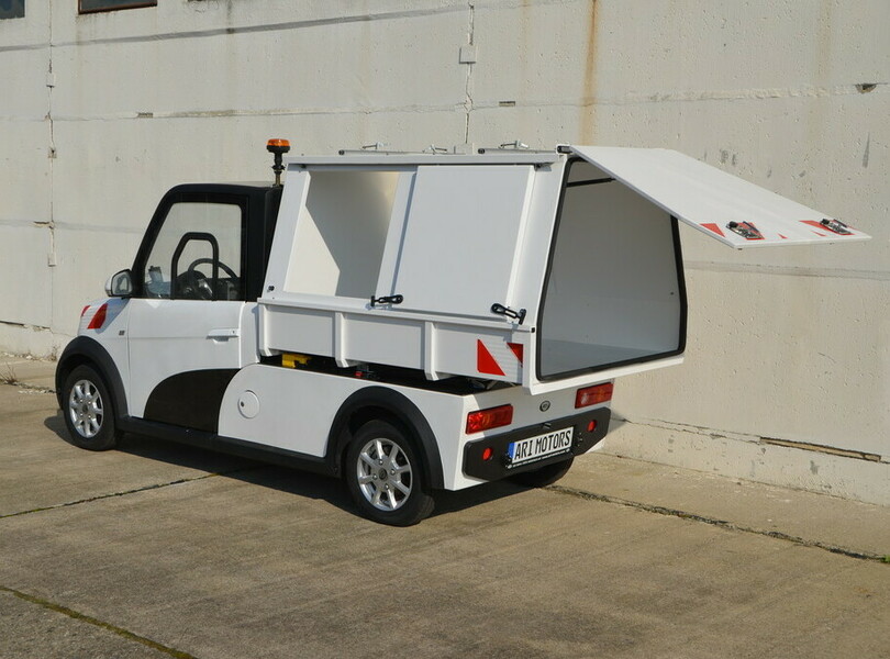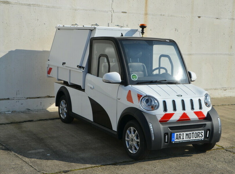 Ari Motors aus Borna bei Leipzig erweitert das Einsatzspektrum seines Modells 458. Der kleine Elektrolieferwagen kann jetzt auch als Müllfahrzeug bestellt werden. Mit seinen 3,15 Metern Länge bei einer Breite von 1,30 Meter und 604 Kilo Eigengewicht, kann der kleine Transporter auch auf schmaleren Wegen eingesetzt werden. Der Müllsammelaufbau des Ari 458 ist mit einer Rundumleuchte ausgestattet und verfügt über eine arretierbare Heckklappe sowie zwei seitliche Schiebetüren. Bis zu 531 Kilo Müll können transportiert werden und mittels elektrischer Kippfunktion später entladen werden.