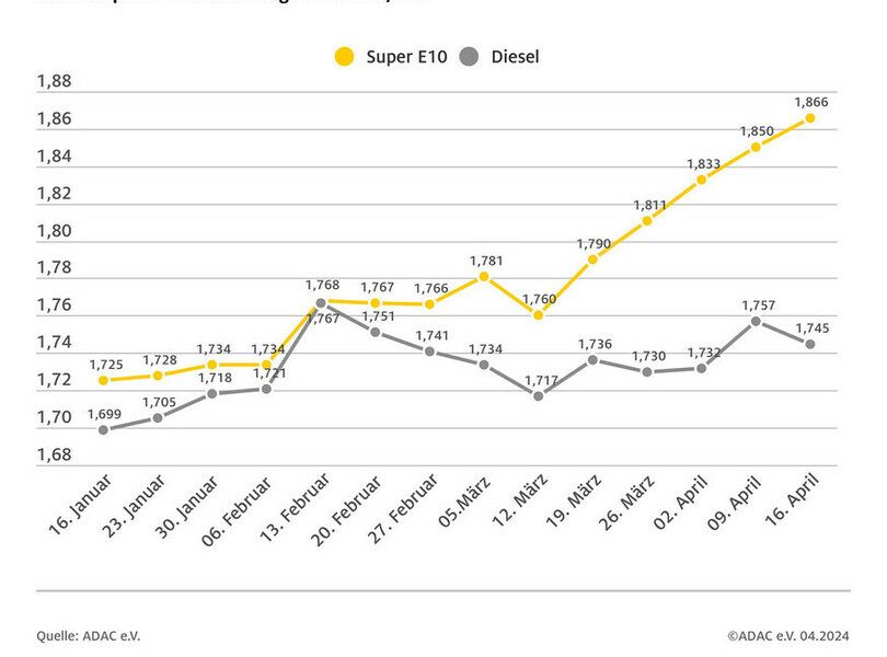 Der Benzinpreis hat einen neuen Jahreshöchststand erreicht. Wie die aktuelle ADAC-Auswertung der Kraftstoffpreise in Deutschland zeigt, kostet ein Liter Super E10 im bundesweiten Mittel zurzeit 1,866 Euro. Im Vergleich zur Vorwoche ist dies ein Plus von 1,6 Cent. Zuletzt war Benzin am 1. Oktober 2023 im bundesweiten Durchschnitt teurer.