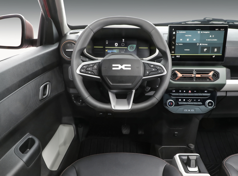 mid Troisdorf - Das Cockpit des überarbeiteten Dacia Spring ist weiterhin aufs Wesentliche reduziert, beinhaltet aber zwei Screens und alle heutzutage notwendigen Assistenten. Uli Sonntag / Dacia