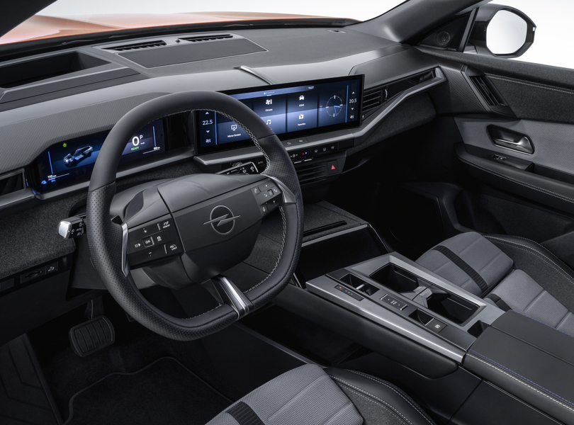 Das Cockpit umfasst einen sehr großen (16 Zoll) und flachen Bildschirm auf der Center-Konsole sowie ein Zehn-Zoll-Fahrer-Infodisplay hinterm Lenkrad Foto: Opel