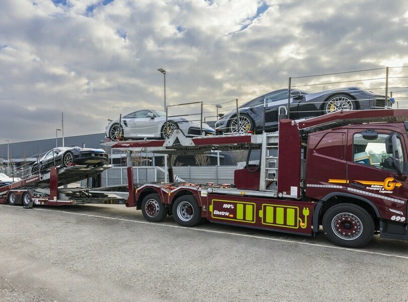 Elektro-Lkw zur Auslieferung von Neufahrzeugen aus dem Porsche-Werk Zuffenhausen in die Schweiz. Foto: Autoren-Union Mobilität/Porsche
