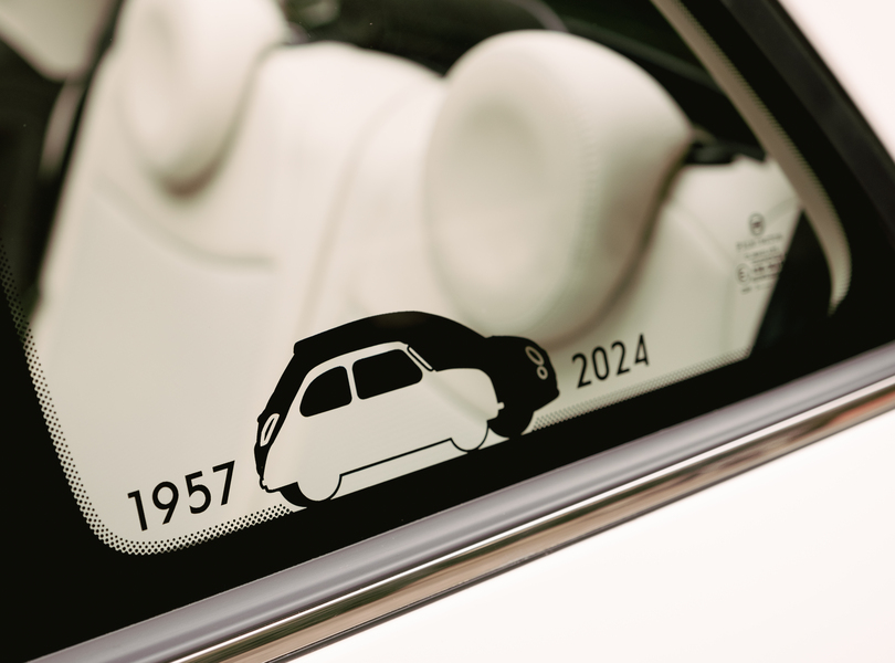 Beim Sondermodell ,,Collezione 1957" sind in den hinteren Seitenscheiben die Silhouetten des ,,Nuova Cinquecento" von 1957 und des aktuellen Fiat 500 zu sehen. So schließt sich der Kreis der beiden Fahrzeuge, die Millionen Autofahrer überzeugten Foto: Fiat-Stellantis