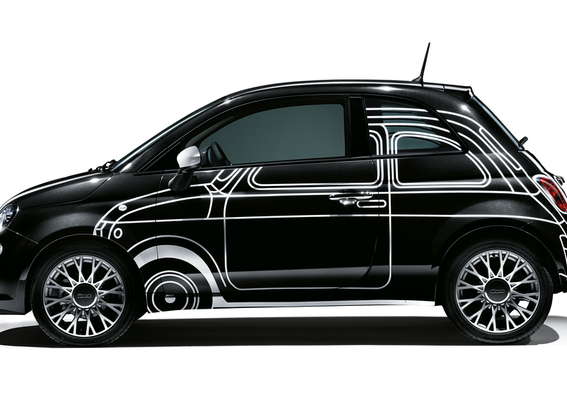 Vom Sondermodell des israelischen Konzeptkünstlers Ron Arad mit einer grafischen Fiat 500-Silhouette auf schwarzem Lack gab es nur 200 Exemplare Foto: Fiat_Stellantis