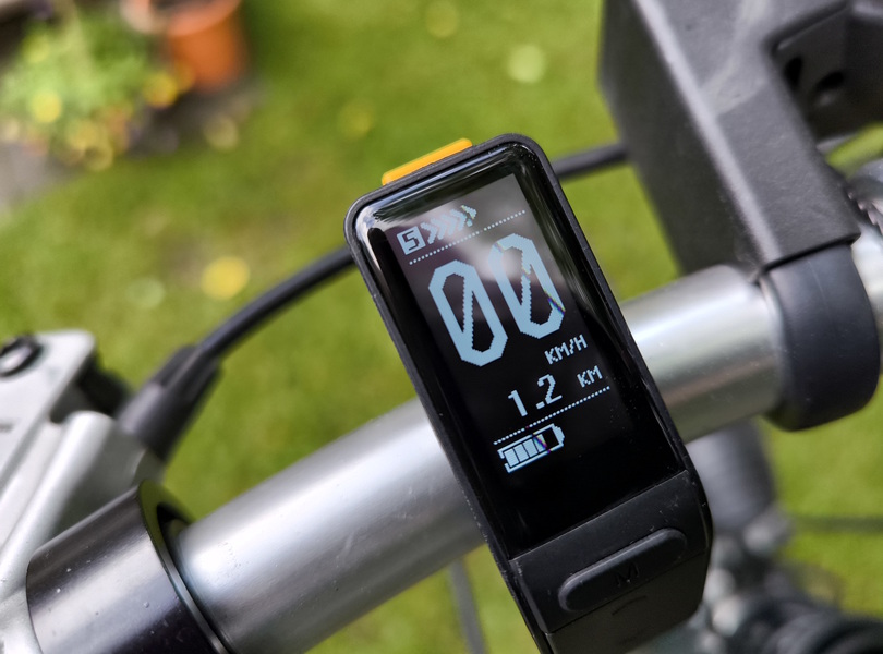 Eine schöne Lösung ist das kleine Lenkerdisplay, über das sich auch die Unterstützungsstufe einstellen lässt. Die Streifen in der Grafik sind ein fotografisches Artefakt. Für das menschliche Auge sieht die Anzeige tadellos aus Foto: SP-X/Mario Hommen