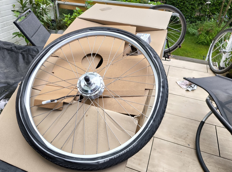 Bei Swytch muss man ein zum Umbau-Fahrrad passendes Vorderrad bestellen. Vor dem Einbau in das Fahrrad müssen noch Schlauch und Mantel aufgezogen werden Foto: SP-X/Mario Hommen