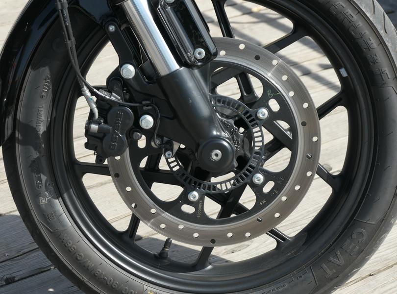 Bei den Bremsen setzt sich die vordere Einzelscheibe eher dezent in Szene, während die hintere sehr kräftig verzögert Foto: fbn