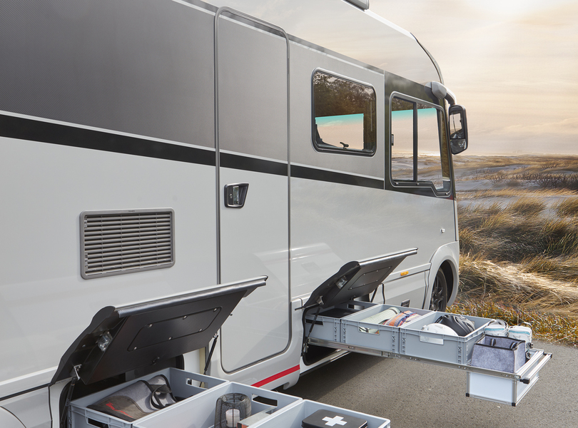 Zugänglich sind die Stauräume im Doppelboden über hochgezogene Busklappen, die einheitlich in der Seitenschürze integriert sind und sich sogar in die Zentralverriegelung einbinden lassen Foto: Niesmann+Bischoff
