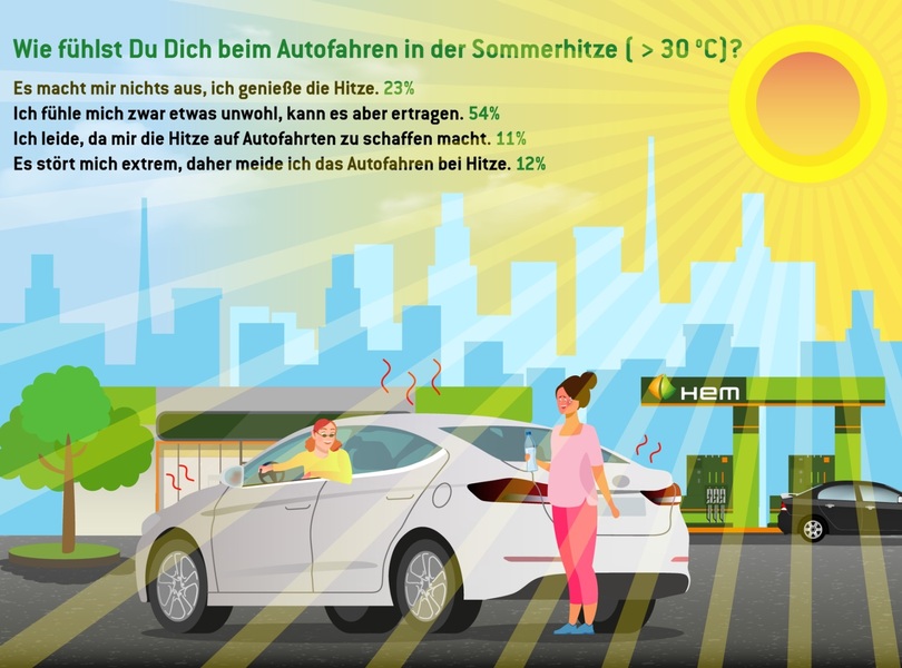 Brütende Hitze im Auto macht die Fahrt nicht nur unangenehm, sondern noch dazu gefährlich. Eine aktuelle Umfrage der Tankstellenkette HEM zum Thema 'Autofahren bei hohen Temperaturen' zeigt, wie die Deutschen mit der Sommerhitze umgehen und welche Maßnahmen sie ergreifen, um im Straßenverkehr cool zu bleiben.