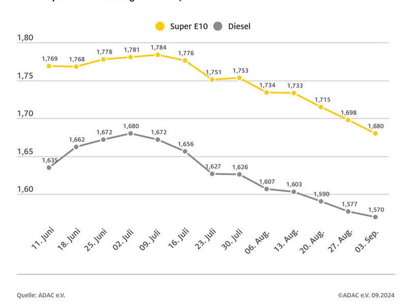 Die Spritpreise in Deutschland sind im Wochenvergleich weiter gesunken. Das hat eine ADAC-Auswertung auf Basis von mehr als 14.000 Tankstellen ergeben. Demnach erreicht der Preis für einen Liter Super E10 ein neues Jahrestief. Im Vergleich zur Vorwoche sank er um 1,8 Cent pro Liter von 1,698 Euro auf aktuell 1,680 Euro im bundesweiten Durchschnitt. Auch der Dieselpreis ist im Vergleich zur Vorwoche erneut gefallen. Aktuell liegt der Durchschnittspreis bei 1,570 Euro pro Liter, in der Vorwoche kostete er noch 1,577 Euro je Liter, ein Rückgang um 0,7 Cent.