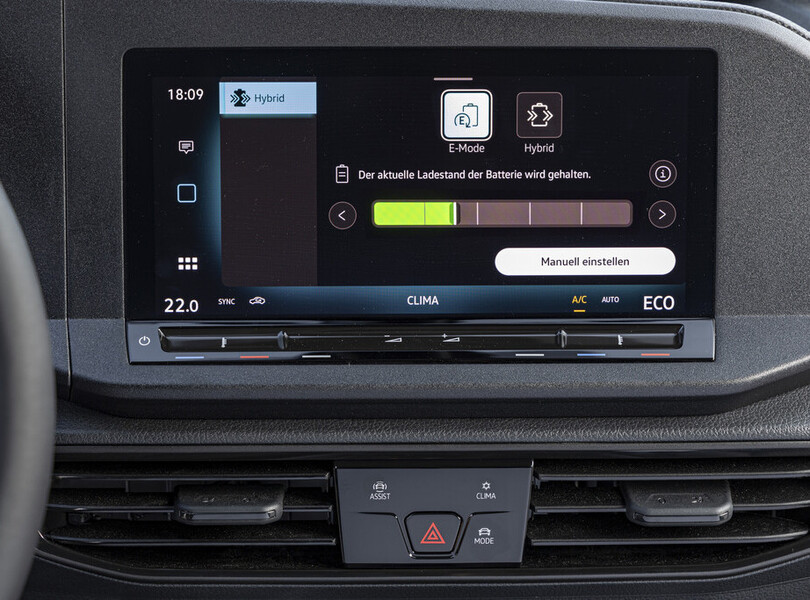 Im VW Caddy eHybrid mit Plug-in-Hybridantrieb kann via Display entschieden werden, wann die elektrische Reichweite genutzt werden soll. Foto: Autoren-Union Mobilität/VWN