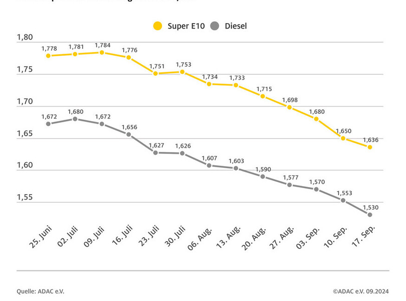 Die Talfahrt der Kraftstoffpreise setzt sich fort. Im Vergleich zur vergangenen Woche haben die Preise für die beiden Kraftstoffsorten Benzin und Diesel erneut nachgegeben und sind jetzt auf einem Preisniveau, das zuletzt Ende 2021 so niedrig war. Wie die aktuelle ADAC-Auswertung der Kraftstoffpreise in Deutschland zeigt, kostet ein Liter Super E10 derzeit im bundesweiten Mittel 1,636 Euro und damit 1,4 Cent weniger als in der Vorwoche. Der Dieselpreis ist binnen Wochenfrist sogar um 2,3 Cent abgerutscht und liegt aktuell im bundesweiten Mittel bei 1,530 Euro.