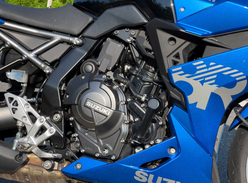 . Neben der sportlich-blau leuchtenden Vollverkleidung dominiert eine klare Technikaffinität, die von gut sichtbaren Schläuchen, Kabeln, Rahmenrohren und augenfälligen Schraubverbindungen herrührt Foto: Suzuki