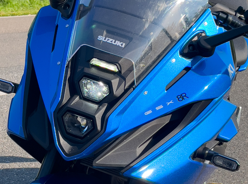 Die übereinander angeordneten Projektionsscheinwerfer dienen allen Mittelklassemodellen des neuen Suzuki-8er-Clans – V-Strom 800/DE, GSX-8S – als Erkennungsmerkmal Foto: Suzuki