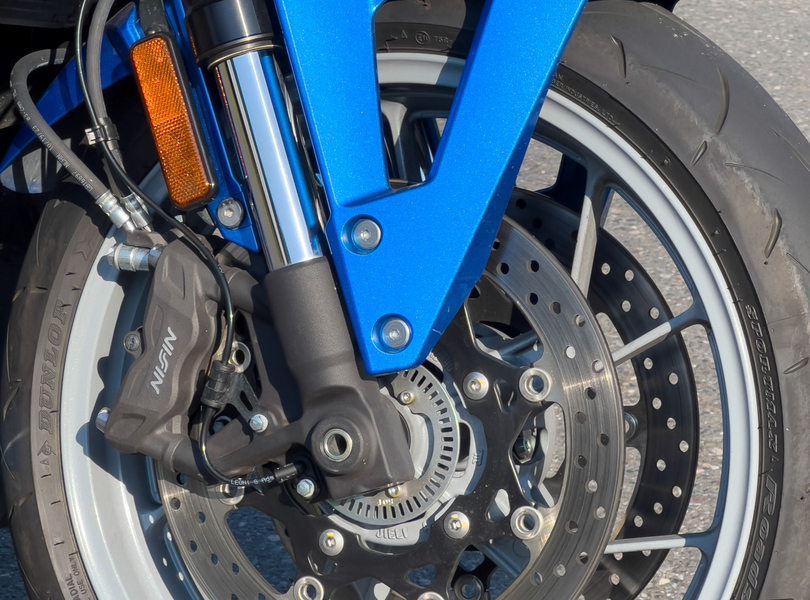 Die Nissin-Festsättel verzögern exakt dosierbar entsprechend der eingeleiteten Handkraft, bestens unterstützt von einem spät einregelnden ABS – die kristallklare Rückmeldung begeistert Foto: Suzuki