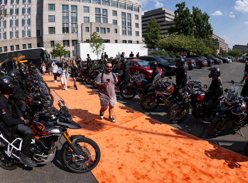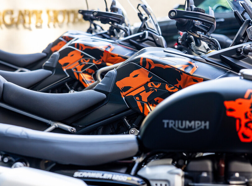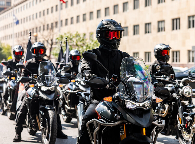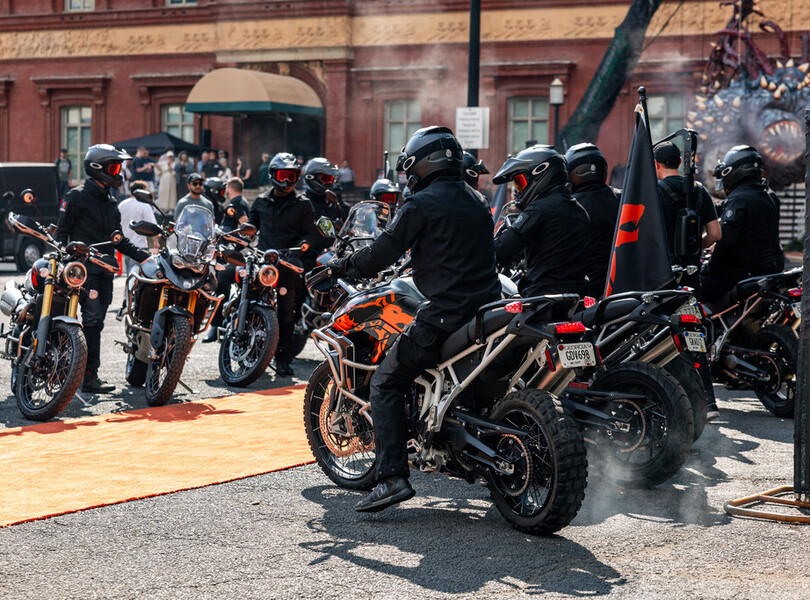 16 Triumph Tiger 900 und Scrambler 1200 in enstprechender Lackierung begleiteten die Premiere von „Call of Duty: Black Ops 6“. Foto: Autoren-Union Mobilität/Triumph
