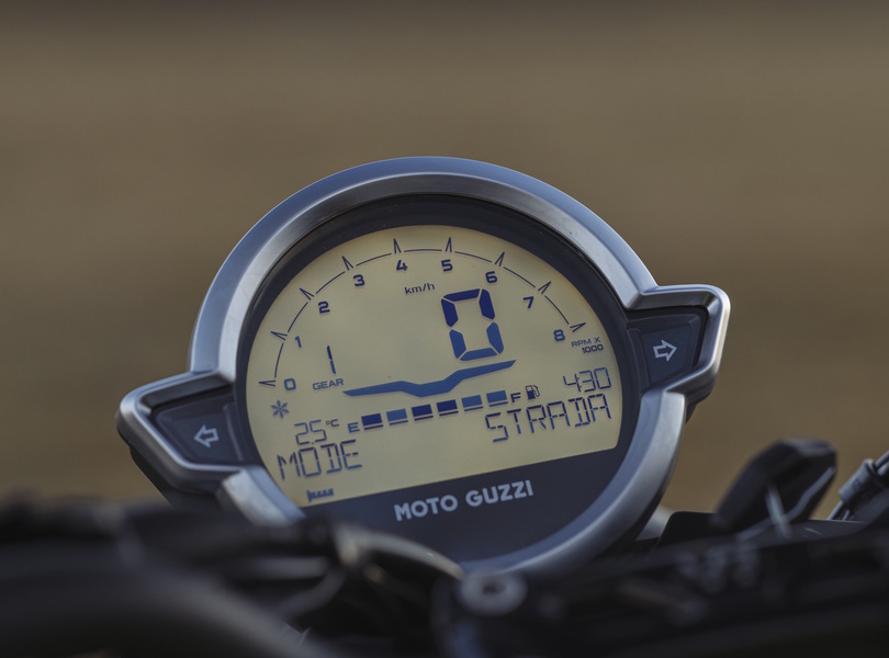Das Cockpit bietet ein LC-Display, welches allerdigns wie ein klassischer Rundtacho inszeniert wurde Foto: Moto Guzzi