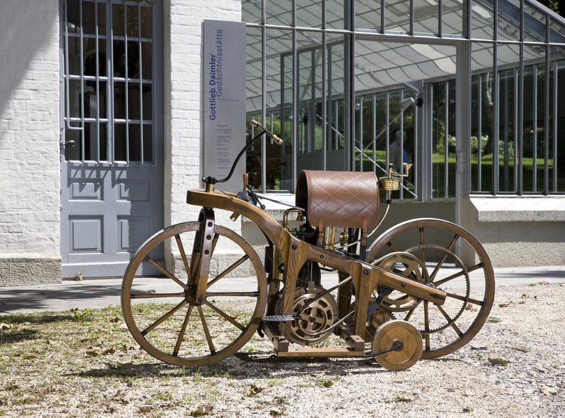 140 Jahre Daimler Reitwagen – Im patentierten ersten Motorrad der Welt testete Gottlieb Daimler die zusammen mit Konstrukteur Wilhelm Maybach entwickelten frühen Verbrennungsmotoren Foto: Mercedes-Benz