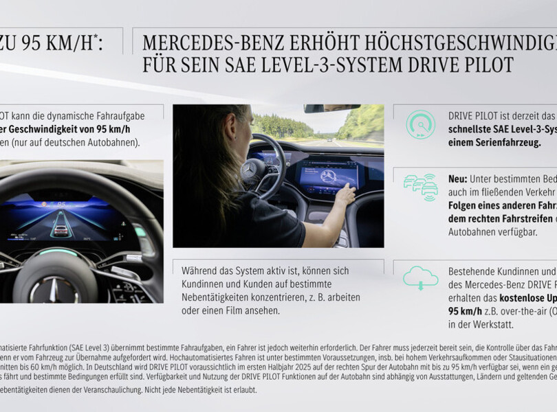 Mercedes-Benz hebt den Drive Pilot auf eine neue Stufe. Das Kraftfahrt-Bundesamt hat für das System zum hochautomatisierten Fahren die Freigabe bis zu einer Geschwindigkeit von 95 km/h erteilt. Bislang waren in Deutschland maximal 60 km/h zugelassen. Die weiterentwickelte Version nach Level 3 soll im Frühjahr in der S-Klasse und dem EQS eingeführt und als Sonderausstattung angeboten werden. Die Preise beginnen weiterhin bei knapp 6000 Euro. Fahrzeuge, die bereits mit Drive Pilot ausgerüstet sind, können Over the air oder in der Werkstatt nachgerüstet werden.