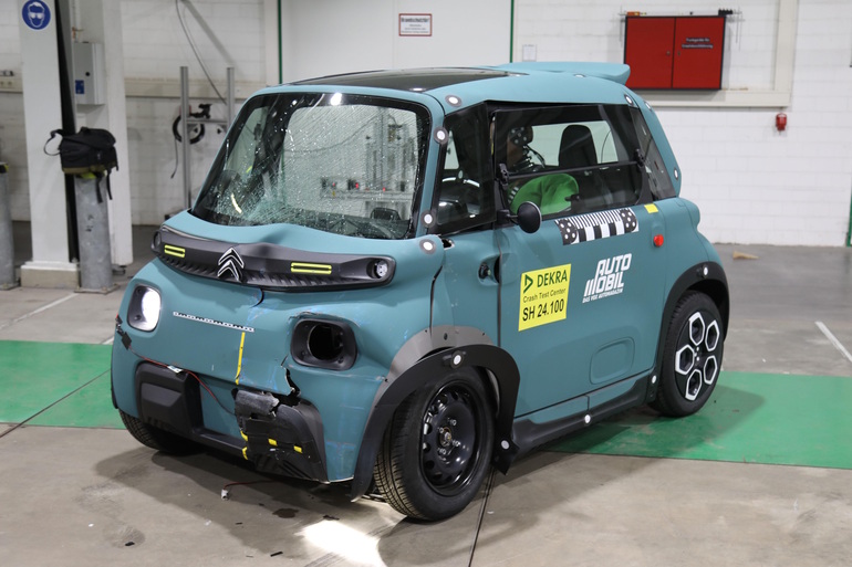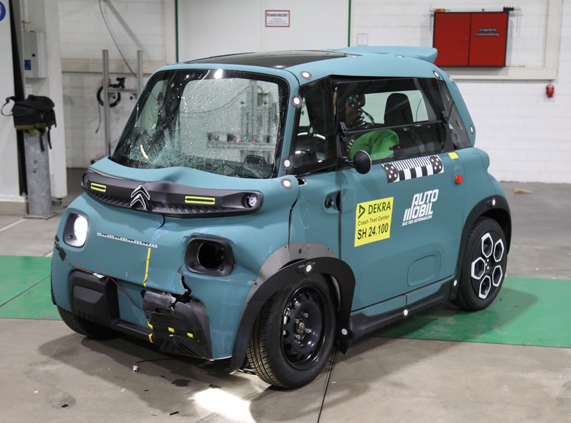 Nach dem Dekra-Frontalcrash sieht der Citroen Ami eigentlich noch gut aus. Allerdings wurde die Aufprallenergie aufgrund der steifen Karosserie an die Insassen geleitet Foto: Dekra / Friedhelm Schwicker