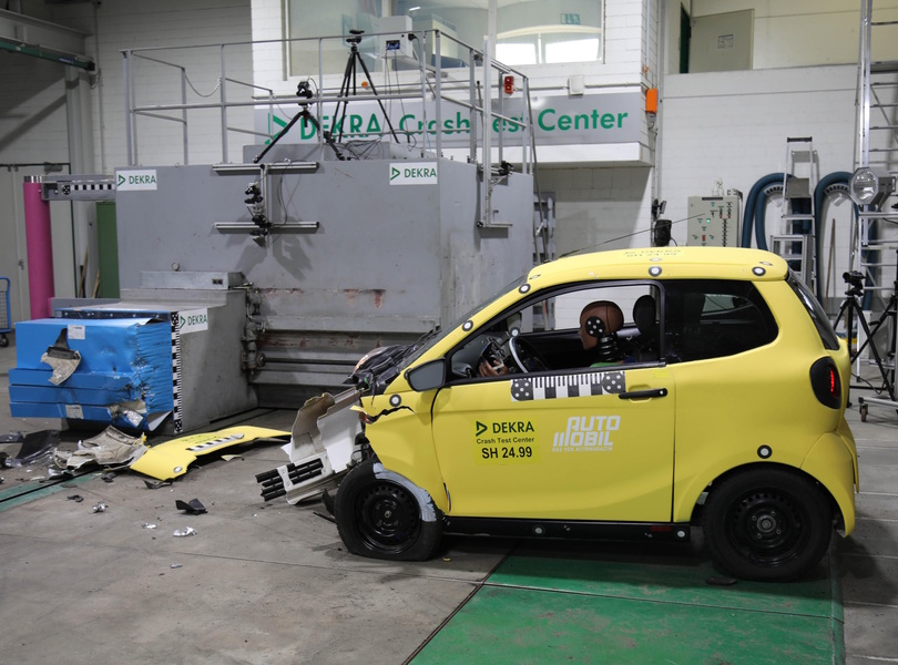 Auch beim Aixam Access hat sich die Fahrgastzelle zwar nicht stark verformt, doch die Belastung durch den Crash war für den Fahrer enorm Foto: Dekra / Friedhelm Schwicker