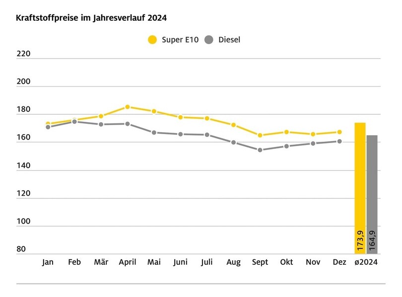 Die Kraftstoffpreise waren 2024 nicht ganz so hoch wie in den beiden Vorjahren, aber das bislang drittteuerste Jahr an der Tankstelle. Wie der ADAC meldet, kostete ein Liter Super E10 im Durchschnitt 1,739 Euro, Diesel lag im Jahresmittel bei 1,649 Euro.