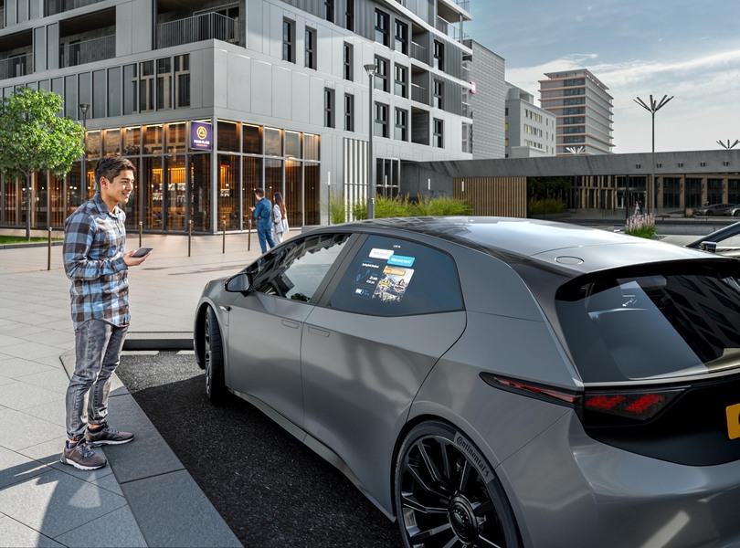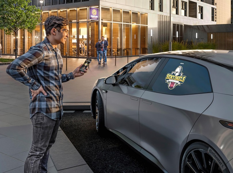 Auch personalisierte Inhalte lassen sich mit der Window Projection anzeigen. Auf dem Stadionparkplatz zeigt das System zum Beispiel das Wappen des Lieblingsvereins an Foto: Continental